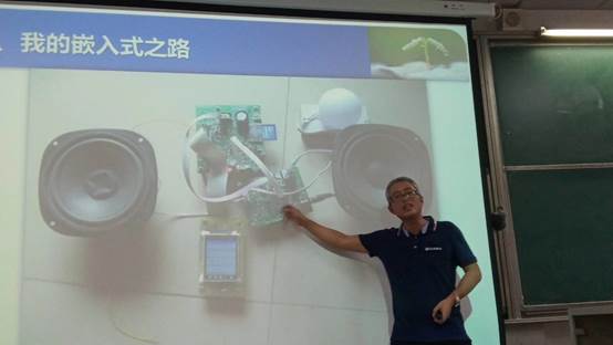 原子哥首先讲述了自己如何从一名电子草根爱好者、民间高手蜕变为创业者,并成为国内知名度极高的嵌入式开发平台供应商的成长经历,接着深入浅出地讲述嵌入式技术现状与发展趋势,然后结合自己撰写的十几本专业著作,详细分享了“真正以项目角度出发”学习嵌入式系统技术的方法。他风趣、睿智的语言引得演讲现场掌声、笑声不断。