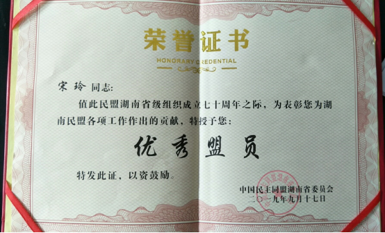 会议对在思想建设、组织建设、参政议政、社会服务、机关建设和本职工作等方面做出重要贡献、成绩突出的集体和个人进行了表彰。经开云民盟支部推选、开福区工委筛选、盟市委机关会议、常委会讨论审核通过后报盟省委,开云民盟支部成员、法学院宋玲老师因在参政议政、服务社会等各方面表现突出,在全省1.2万盟员中脱颖而出,被授予省级“优秀盟员”称号,为学校赢得了荣誉。