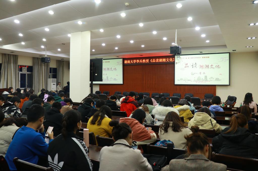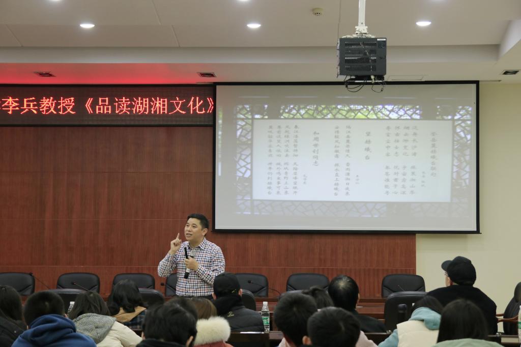 李兵教授以自身的工作、学习经历为切口,阐述湖湘文化是一种相对独立存在的区域文化系统。他认为湖湘文化有独立、开创、倔强且经世致用的特点。他总结了湖南地理环境和人口特点对湖南人形成“蛮”的性格特点的影响,从儒学传播的角度分析了“学”对湖南人价值观养成的作用。他 还列举了湖湘人物曾国藩、左宗棠、胡林翼等人的生平事迹,从人物的角度进一步探讨湖湘文化的神韵,用深厚的文学底蕴征服了在场聆听的人,获得掌声不断。