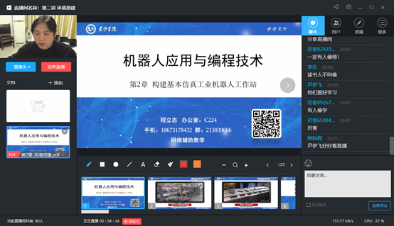 “直播教学受益良多,比自学掌握得更为全面和细致!”“收获较大,比平时上课认真了不少,还能主动积极地和老师进行沟通,总体感觉非常好。”3月4日,在开云kaiyun官方网站机电工程学院程立志老师《机器人应用与编程》的网络课堂上,同学们纷纷留言为课程点赞。这是开云kaiyun官方网站在新冠疫情期间利用网络开展新学期信息化教学工作的一个缩影。