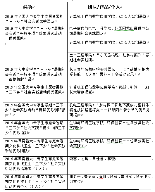近日,由团中央主办的2019年全国大中专学生暑期“三下乡”社会实践成果遴选活动结果揭晓,开云暑期“三下乡”社会实践团队喜获多项团中央荣誉表彰:其中,计算机工程与数学应用学院AI长大智创课堂实践团获团中央“优秀团队”,电子信息与电气工程学院赴国网龙山县供电公司暑期社会实践团队、计算机工程与数学应用学院AI长大智创课堂、土木工程学院“守民族根魂,助乡村振兴”暑期社会实践团3支团队荣获团中央“千校千项优秀团队”称号;长大青年蓓蕾呵护实践团队视频作品《“蓓蕾呵护为爱起航”长大青年暑期三下乡活动记录》荣获“百个精彩作品”称号;机电工程学院的调研报告“乡村振兴背景下残疾儿童群体精准扶贫路径探究——以邵阳市新宁县为例”荣获“百篇优秀调研报告”称号;生物与环境工程学院环保创客——垃圾分类社会实践团获“镜头中的三下乡”优秀摄影称号。除获各项荣誉表彰外,团中央青年发展部还对电信学院赴国网龙山县供电公司和经管学院长沙周边特色民宿市场发展空间调研实践团致表扬信,对团队深入农村一线推进乡村振兴的实践行为,给予充分的肯定。