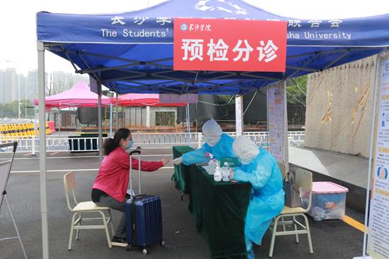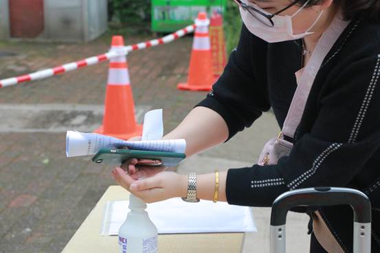 演练共设置学生入校、医护应急、学生就餐、学生入寝、师生入教室上课等五个环节。其中,在报到入校环节,由工作人员扮演的返校学生们在主校门外保持间隔1米以上排队依次进行体温测量,体温无异常且核验过所有报到指定手续的学生方能进入消杀区,继续后续报到程序。一名“学生”因测量体温超过了37.3℃,被工作人员带往预检分诊点进行体温复测、症状问询等预检分诊程序。
