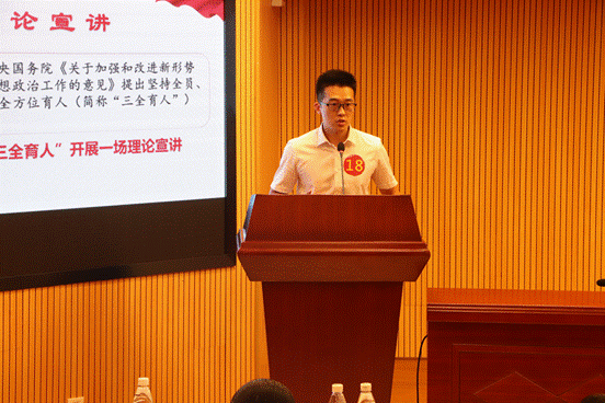 副校长周明侠出席比赛现场。在“谈心谈话”项目比赛中,辅导员们通过临时抽签两两分组,分别扮演“辅导员”和“学生”,以情景再现方式限时开展谈心谈话。面对在寝室违规使用电器开展美食直播的“学生”姚玲,“辅导员”付方彦充分运用铺垫、共情、制约、引导等谈话技巧,使“学生”受到教育与感染后诚恳地表示“要做一名高素质的美食主播”。在“理论宣讲”比赛中,辅导员们成竹在胸,才思敏捷。来自经管学院的辅导员谭敏捷结合自己的工作特点,从三个角度阐述了对“三全育人”的理解。他的宣讲小中见大、思路清晰、见解到位、语言流畅,获得现场观众的热烈掌声。