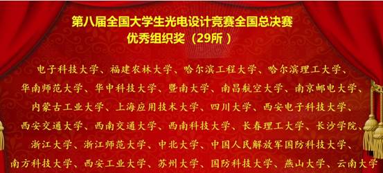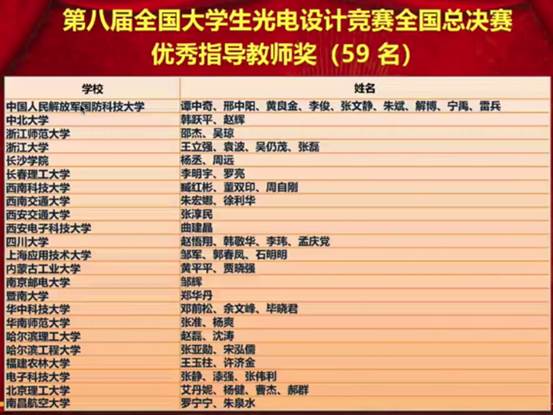 8月30日,开云学子在第八届全国大学生光电设计竞赛总决赛荣获全国一等奖金奖1项、全国三等奖1项和中部赛区一等奖2项、三等奖3项,电信学院杨丞和周远两位老师荣获全国总决赛优秀指导教师奖,开云荣获全国总决赛优秀组织奖。
