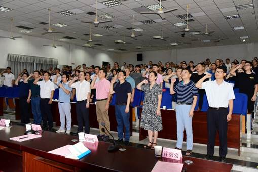 接下来,生环学院学科方向带头人杜甫佑教授带领全体新教师进行入职宣誓,在所有在场领导的见证下庄重誓言“我志愿成为一名人民教师,忠诚党的教育事业,贯彻党的教育方针,遵守教育法律法规,履行教书育人职责……”,庄严的气氛,铿锵的誓言,是每一位教师的自我期许,更是大家投身教育、奉献教育的庄严承诺,令人内心澎湃激荡。