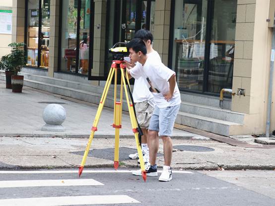 在通往龙潭湖的林荫大道上,一些土木学院的学生正在做工程测量实训——三个人为一组,一人操作水准仪,一人手握水准尺,一人记录表格。2018级土木专业的彭勇同学说,这是在补假期的实践作业,虽然实际操作起来有点困难,但同学们仍然干劲儿十足。