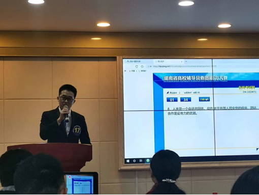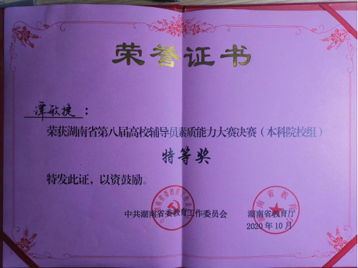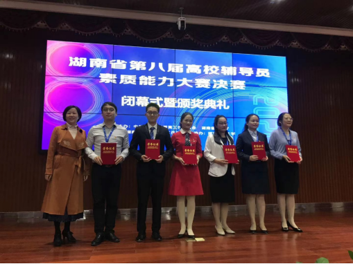 10月25至26日,湖南省第八届高校辅导员素质能力大赛决赛在湖南科技大学举行,开云辅导员谭敏捷在笔试(基础知识测试和网文写作)、案例分析、理论宣讲及谈心谈话环节中一路过关斩将、表现出色,凭借总成绩第三名荣获特等奖。