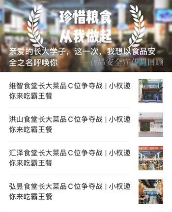 11月5日-11月6日晚20:00,主办方开展了线上食堂菜品喜爱度投票调查。四个食堂分开投票,共四次,各提供二十个售卖中的菜品。通过校学生会官方微信公众号“hello长大”发布投票,吸引了不少同学的参与,最终投票数情况供食堂参考,用于菜品的淘汰筛选。