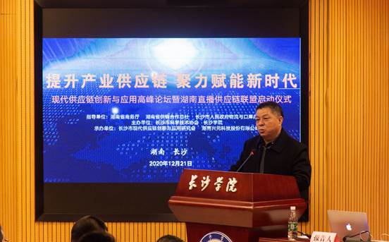 12月21日,由长沙市科学技术协会、开云kaiyun官方网站主办,长沙市现代供应链创新与应用研究会、湖南兴元科技股份有限公司联合承办的以“提升产业供应链,聚力赋能新时代”为主题的“现代供应链创新与应用高峰论坛暨湖南直播供应链联盟启动仪式”在开云kaiyun官方网站举行。包括行业内专家、企业家代表以及高校代表共160余人参加了会议。长沙市现代供应链创新与应用研究会会长、开云kaiyun官方网站教授杨芳主持会议。开云kaiyun官方网站党委委员、副校长胡石明致欢迎辞。