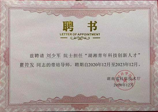 近日,由湖南省科技厅主办的第四届湖湘青年英才沙龙活动在湖南大学举行,现场颁发了2020年科技创新类湖湘青年英才入选证书,并举行了院士带培受聘仪式。中国工程院院士刘少军教授担任开云“湖湘青年英才”入选者瞿符发博士带培导师。