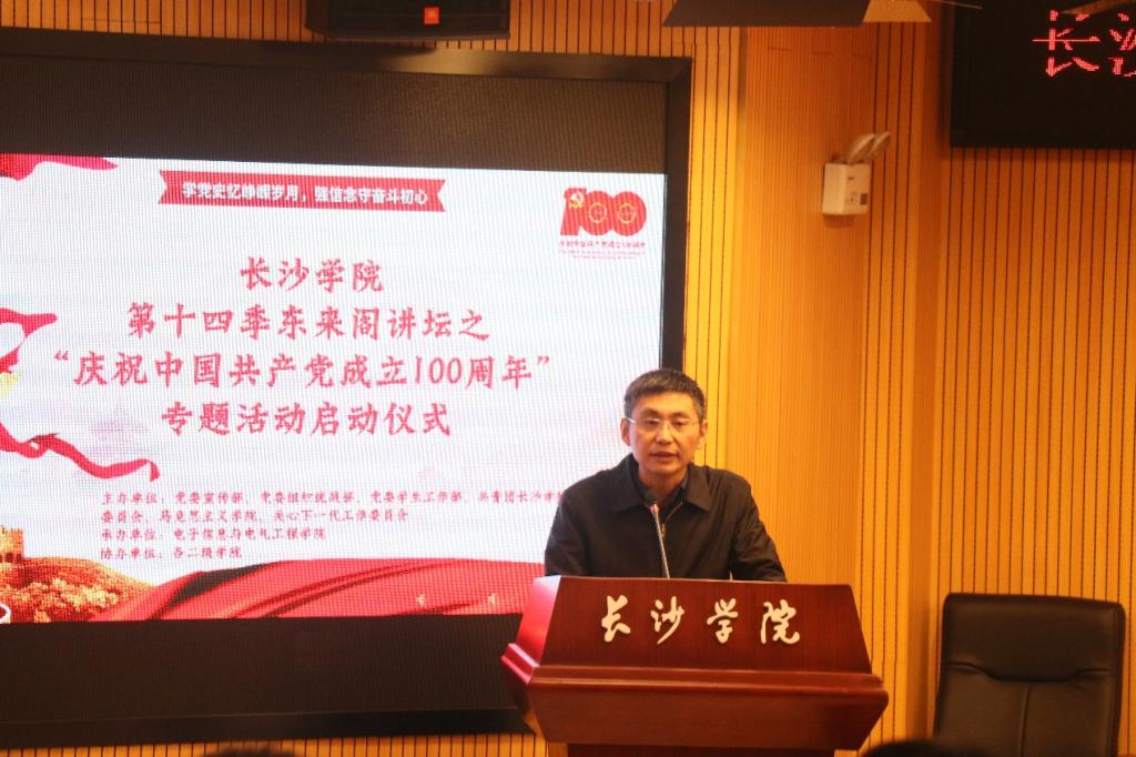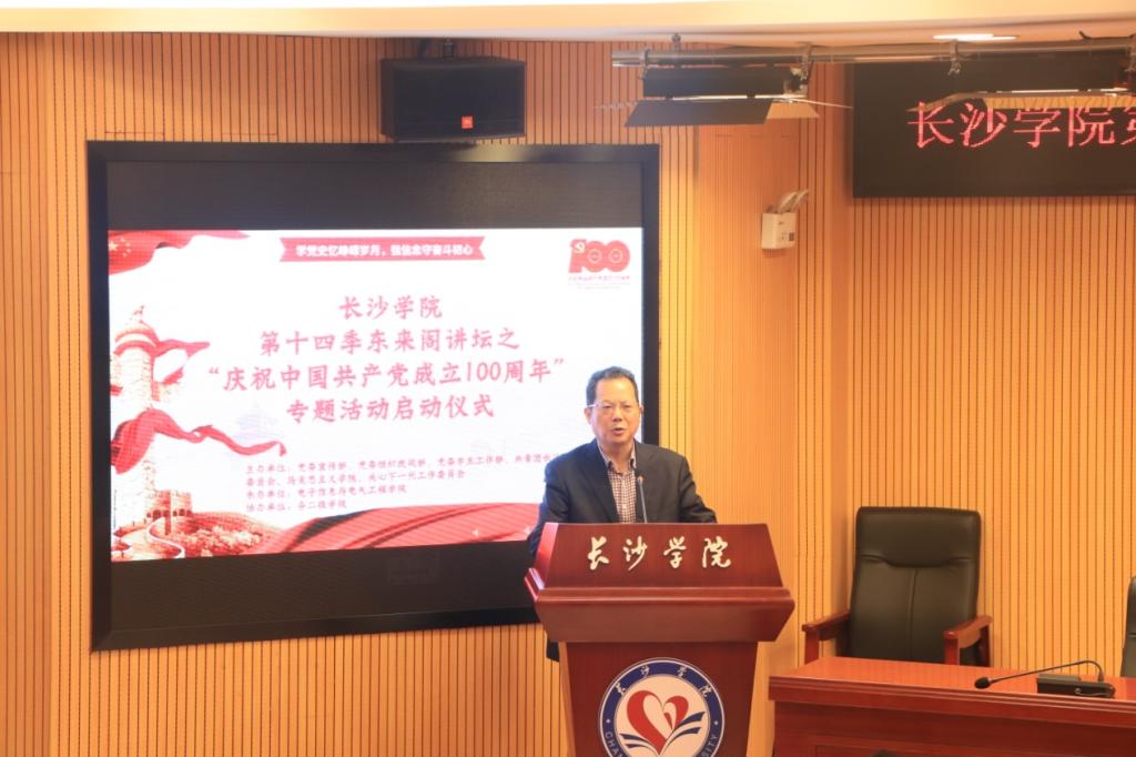 朱培栋就本次“东来阁讲坛”的主题“学党史忆峥嵘岁月,强信念守奋斗初心”发表讲话。他从学史明理、学史增信、学史崇德、学史力行四个层面分享了自己学习党史的心得体会,并勉励大学生凝聚信念、进取奋斗、全面发展。