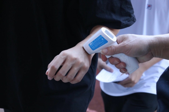 在接种等候区,工作人员逐个检测接种者实时体温,做好防护第一步。