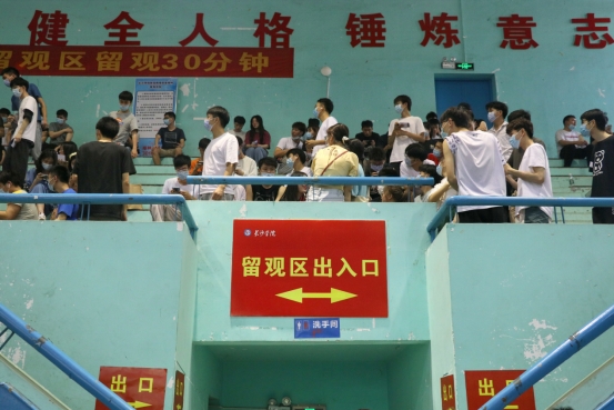 接种完的学生在留观区经过30分钟留置观察,确认无不适症状后,方可交表从出口离开临时集中接种点。整个接种过程程序严谨,有条不紊。