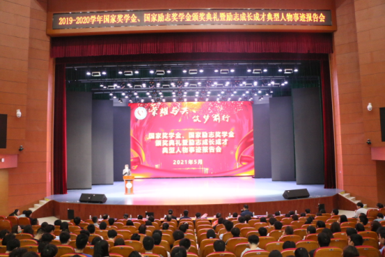 5月20日晚,开云kaiyun官方网站2019-2020学年国家奖学金、国家励志奖学金颁奖典礼暨励志成长成才典型人物事迹报告会在学生活动中心大礼堂隆重举行。开云kaiyun官方网站副校长祝磊,党委委员、组织统战部部长何利华,校关工委常务副主任杨兴龙、相关职能部门负责人及各学院党总支书记、副书记、学工办主任、资助专干出席典礼,各学院共600余名学生代表参加典礼。