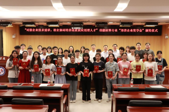 与会领导和嘉宾分别为获得一、二、三等奖的25名学生颁发了荣誉证书和奖金。“邦普奖学金”一等奖获得者、2018级功能材料专业学生雷恬代表获奖学生发言,她对学校和企业的共同教育培养深表感谢,表示将在成长的道路上学会感恩,在学习生活中懂得坚持,努力成为充满正能量的人,成为对国家对社会有用的人。