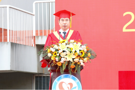 典礼在雄壮的国歌声中拉开帷幕。黄立宏深情致辞。他代表学校向2021届毕业生送上衷心祝福。今年是建党100周年,黄立宏以“激扬青春风采,献礼百年华诞”为题给毕业生们上了最后一课。他对同学们提出了三点殷切希望:一是爱党爱国,勇担使命。坚定不移跟党走,勇担实现中华民族伟大复兴的时代使命。二是立德修身,行稳致远。在走上工作岗位、踏入社会时,懂得立德修身、行稳致远。三是脚踏实地,知行合一。向肖正君、李兵等先进校友看齐,秉承“力学笃行”校训,传承发扬“崇德求真,实干担当”的长大精神,保持不畏艰险的刚健勇毅,将人生之根和事业之根深扎于祖国大地,让青春焕发出最绚丽的光芒。