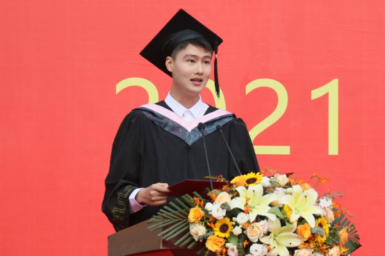 毕业生代表、湖南省优秀毕业生、“国家大学生志愿服务西部计划”志愿者、影视艺术与文化传播学院赵泽安同学发言。他讲述了自己与长大一同成长的过程,呼吁大家在社会上要秉持初心、怀揣信仰和牢记长大人的身份,以青春之我奉献青春之国。