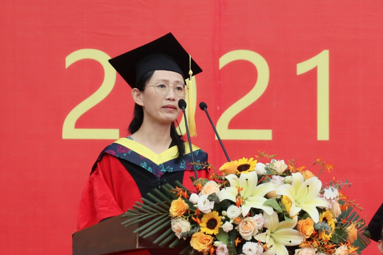 入选年度影响力全球前2%顶尖科学家榜单、来自土木工程学院的杨瑞珍博士作为教师代表为毕业生们送上了毕业祝福。她从三个方面给予同学建议:一是要力学。多读书、多思考,静水流深,自我沉淀,方可有所提升。二是要笃行。有目标,有坚持,为自己的理想而奋斗。三是要做最好的自己。不必与他人比较,自己就能绽放最优秀独特的光芒。最后,杨瑞珍为每一位毕业生送去真挚祝福,希望广大毕业生成为有理想有本领有担当的时代新人。
