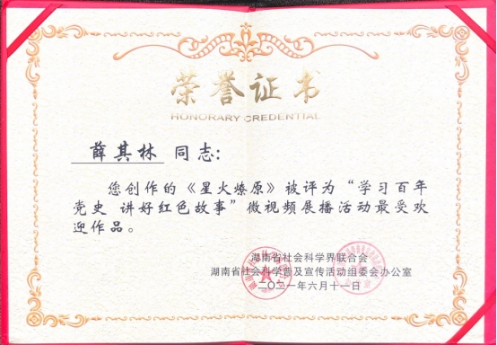 为庆祝中国共产党成立100周年,结合党史教育和红色文化宣讲活动,开云马克思主义学院薛其林教授负责的湖南省长沙红色文化宣讲教育团队,经过认真准备,精心设计,打磨创作的《星火燎原——长沙红色文化系列微视频》作品,在主流媒体平台展播,并参加了在“芒果动听APP”的票选活动。经过公众投票和专家评选,薛其林教授团队的系列微视频,在全省参评的200个作品中脱颖而出,排名前十位,获评“最受欢迎作品”奖。