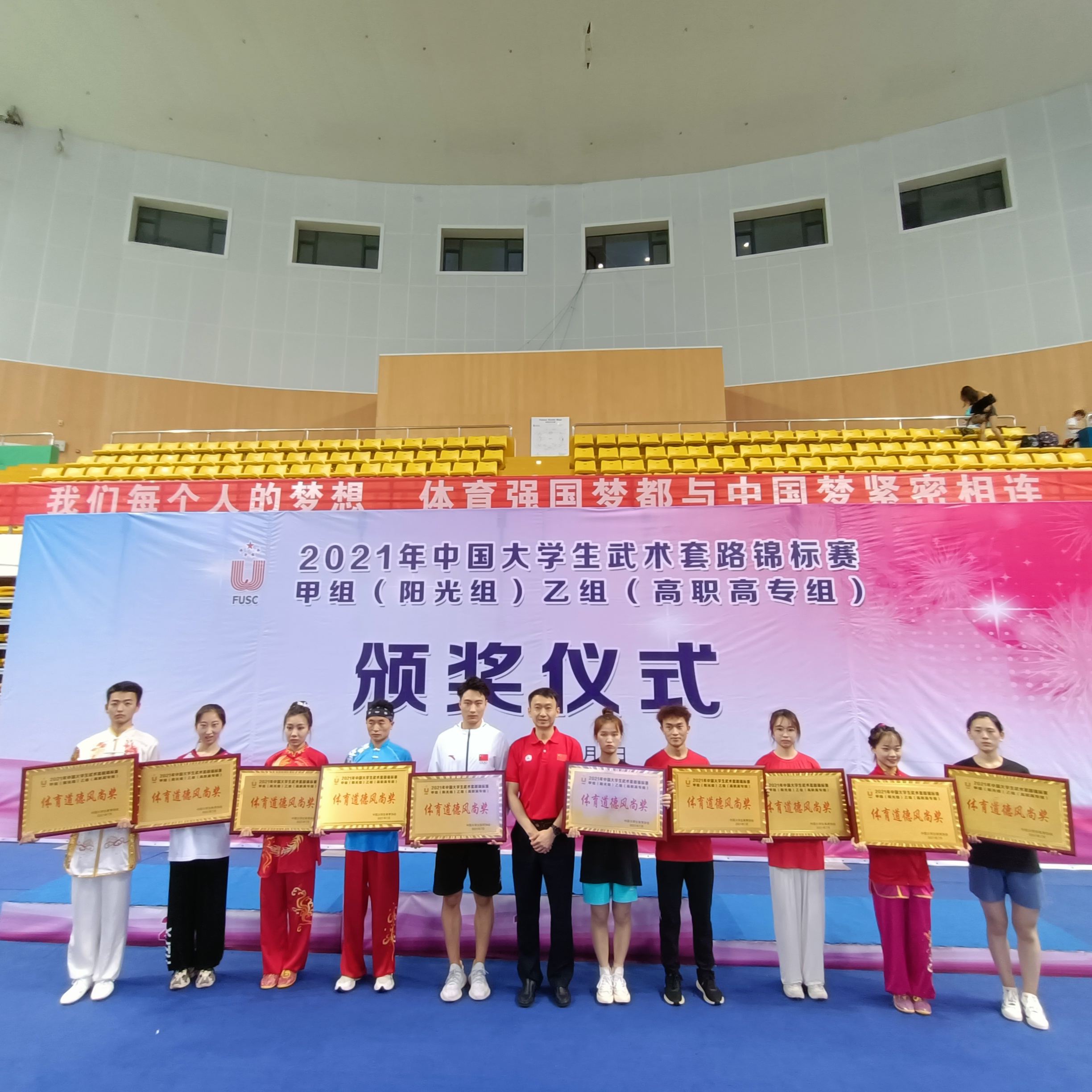 2021年中国大学生武术比赛于7月3日至8日在河北省唐山九江体育中心隆重举行。体育学院党总支副书记段岩任领队,与教练刘毅军、熊玮老师一起,带领开云代表队取得了4金5银4铜的优异成绩,并获赛事组委会授予“体育道德风尚奖”。刘毅军老师被评为优秀教练,宋林志被评为优秀运动员。