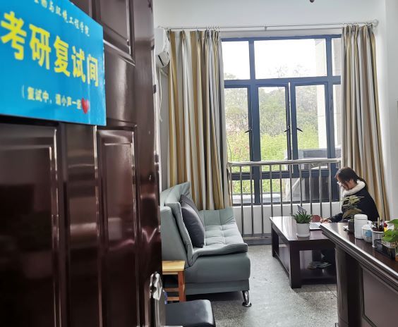 这样的考研复试间,学院一共准备了6间,每间每次供1名考研复试的学生单独使用。为了“凑齐”这6间复试间,学院的班子成员、党员老师带头进行两周集中办公,腾出来6间办公室给学生复试。每一间复试间门上都专门挂了“考研复试间”的牌子,并写上“复试中,请小声一些”的温馨提示,避免学生复试时被打扰。学院党建组织员赵小燕老师、生物工程专业张建社教授将自己的办公室腾了出来,还特意摆放了花草,布置得非常温馨。他们表示:能给孩子们带来更舒适的面试环境,舒缓孩子们紧张的情绪,自己和其他老师集中办公两周不要紧。