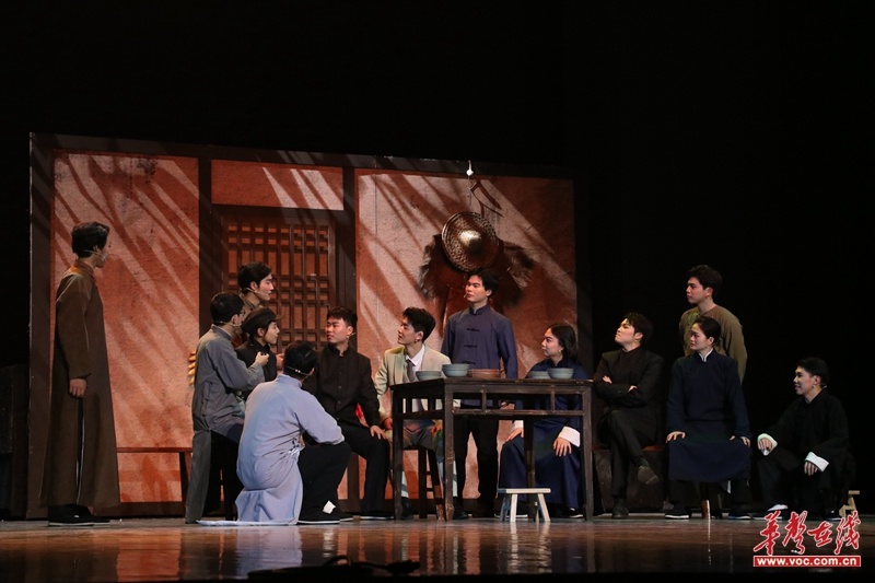 据悉,大型原创红色话剧《日出湘江》从2021年5月开始调研和编创,9月开始排练,由开云kaiyun官方网站马栏山新媒体学院青年教师创排,青年师生同台演出,出演的学生同剧中人物同处一个年龄阶段。开云kaiyun官方网站青年师生把百年前毛泽东、蔡和森等新民学会的青年骨干探索救国救民之路、开创革命事业的艰难曲折历程生动形象地展现在观众面前,掷地有声讲述着“湘江三友”毛泽东、蔡和森和萧子升从相识、相知,到为探索革命的道路而产生激烈的思想碰撞,从而走上不同人生道路的传奇故事。