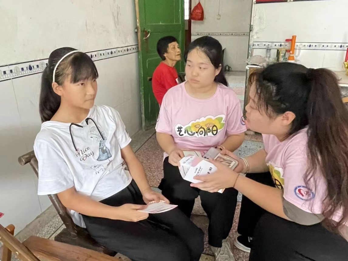 “艺心向阳”团队在对一名当地女童进行女童保护宣讲
