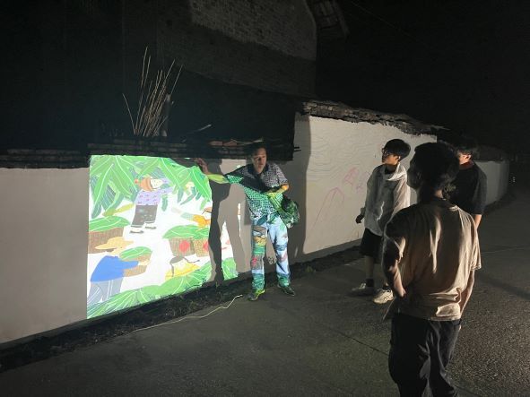 墙体彩绘实践团队指导老师陈祥华连夜和学生讨论设计图稿和定位问题