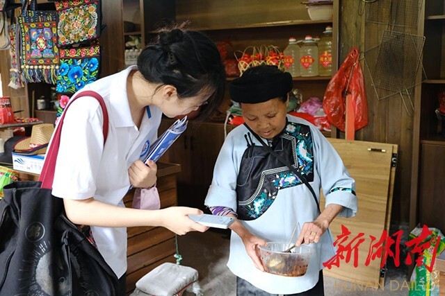 采访调研之余,团队成员还在十八洞村内品尝了葛根酥、罗汉果茶、果酒等美味的当地特产,体验了苗绣、打鼓、串辣椒等苗族特色风俗手艺。