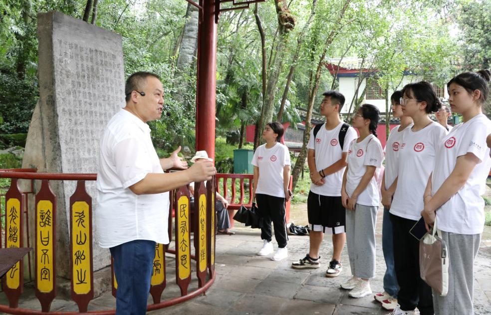 金牌讲解员桂胜利为成员们讲解摩崖石刻