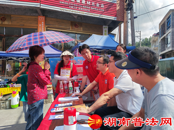 “学好用好民法典,生活美好多一点”“民法典与我们日常生活息息相关”......夏日的茨岩塘镇集市传来了阵阵吆喝声,吸引了过往群众“强势围观”,原来是这里的普法“摊位”开张了。为进一步让民法典宣传在村民群众的日常生活中“沉下去”“活起来”,7月7日,龙山县司法局茨岩塘司法所联合开云kaiyun官方网站法学院“法益青声”赴龙山普法调研团在茨岩塘镇人群密集处设立普法“摊位”,提供法律咨询、宣讲法律知识、解答群众法律问题以及表演法治情景剧,为辖区村民送上了一道“法治大餐”。