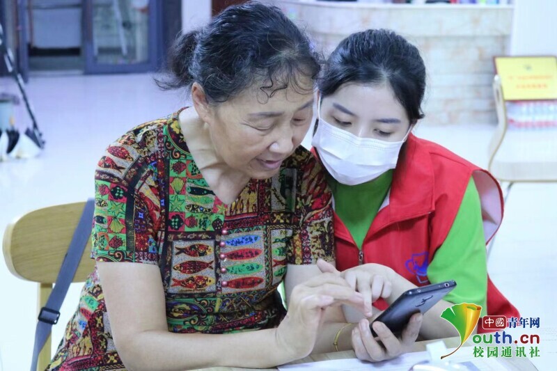 图为在松雅社区课堂上志愿者对老人进行一对一指导过程。 中国青年网通讯员 杨菁 供图
