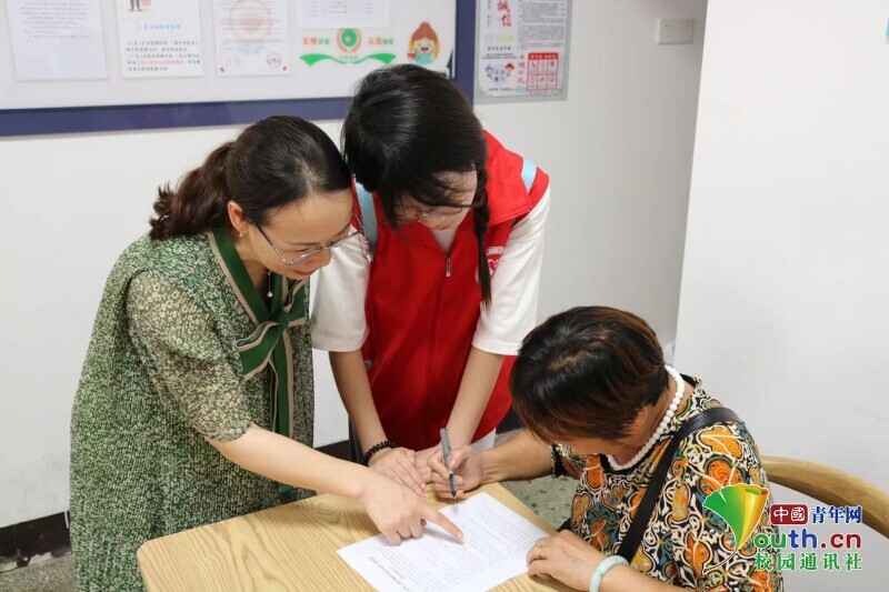 图为团队指导老师和志愿者共同深入杉仙岭社区进行问卷调查。中国青年网通讯员 杨菁 供图