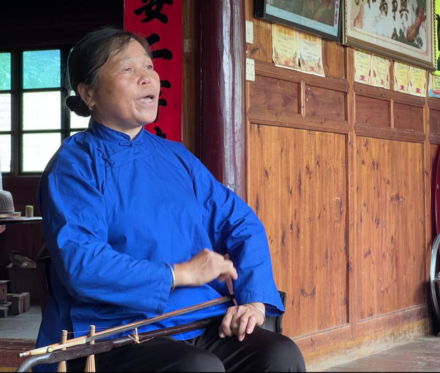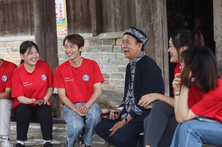 实践团寻访岭南村侗族文化非遗传承人吴祥跃、龙登娥,见证到朴素的文化情怀。乡野之间,实践团队员们围坐一圈,聆听着湖南省第二批非物质文化遗产侗款非遗传承人吴祥跃老人的侗乡故事。“侗款目的在于村里人团结一心、规范习俗、和睦相处,通过教育让侗家伢子都能出去……”采访中,吴祥跃老人讲道。吴爷爷享有很高的威望,是当地的“款首”,几十年如一日,守护着侗文化的“古老约定”。而通道侗族自治县侗戏非遗传承人龙登娥,同吴老一般,守护着那古老质朴的优秀文化。“我唱侗戏40年了,武、旦等各种角色都参演过,侗琵琶等乐器都会,自己也学习二胡,也曾利用‘抖音’等现今的信息传播平台,传播侗戏文化……唱侗戏是我人生中最大的一个爱好。”龙登娥老师动容地说道。