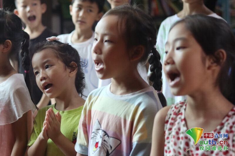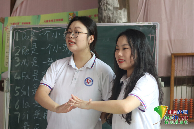支教老师们共同合作,带领小朋友们完成音符手势舞的练习。中国青年网 李馨瑶 供图