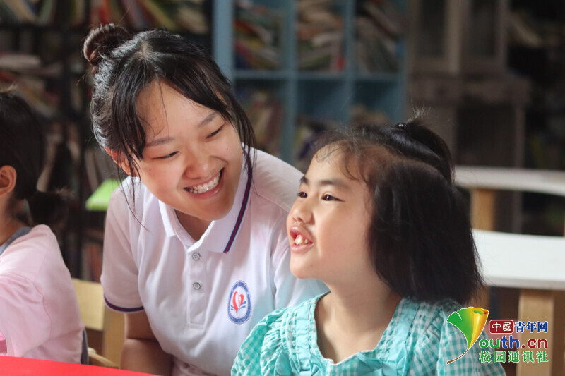 助教老师在课桌旁陪小朋友们一起学习音乐知识。中国青年网 丰一帆 供图
