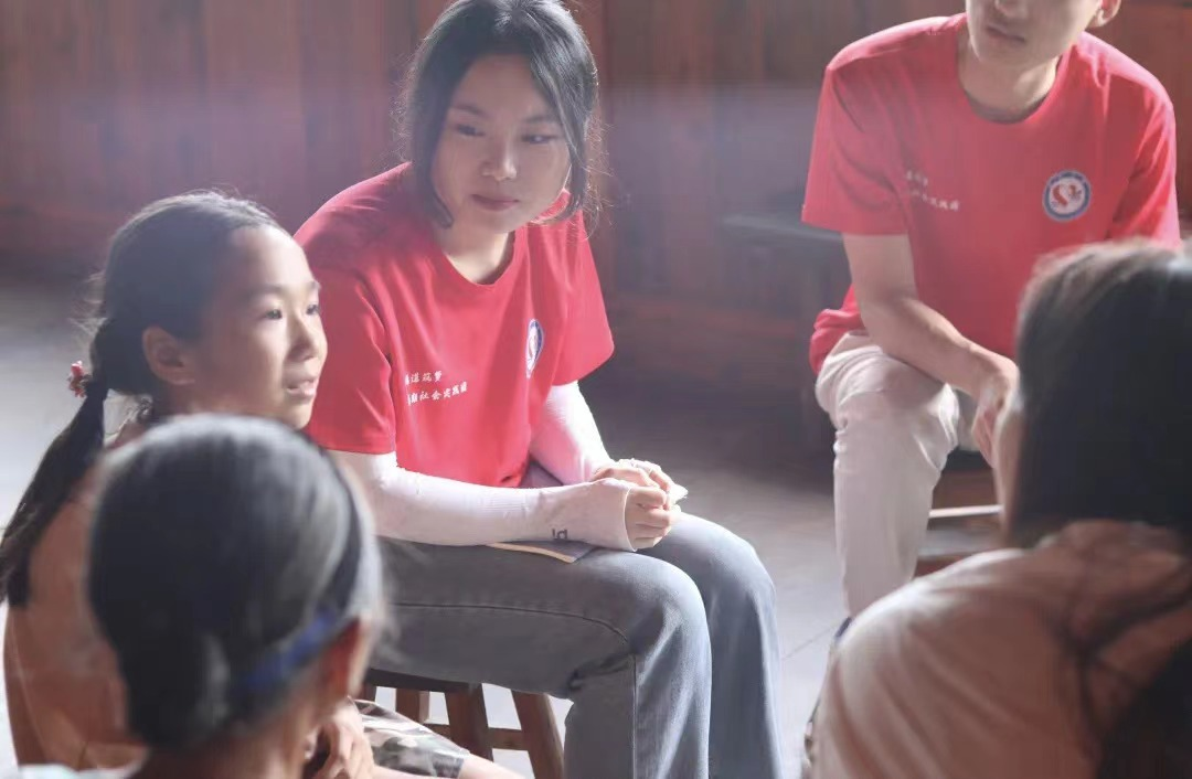 图为实践团成员聆听困境孩童现况。多彩大学生网通讯员 瞿家兴 摄。