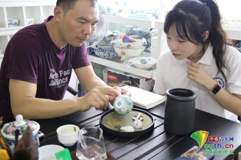 图为深入访谈时商户为团队成员讲解醴陵釉下五彩瓷特点。中国青年网通讯员 周影锋 供图