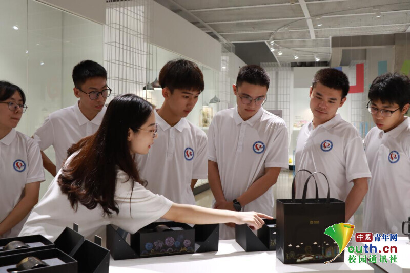 图为工作人员为实践团成员讲解升温变色马克杯等一系列创新产品的创作灵感、原理及纪念意义。中国青年网通讯员 何嘉玲 供图