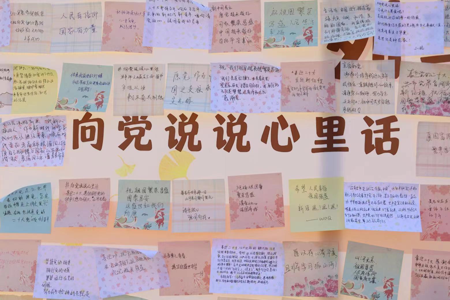 一位同学小心翼翼地打开“漂流瓶”,把精心挑选的花草装入“漂流瓶”中,再将制作好的“漂流瓶”贴在“DIY花草漂流瓶”的展板上;在领取的粉色便利贴上,他认真专注地写下自己对党和祖国的告白:“作为新时代的学子,我们应该继往开来,顺应时代的要求,走高科技强国之路,使自己的脉搏与国家的发展和谐一致,奏强国之乐,谱青春华章!”然后郑重地贴在“向党说说心里话”的展板上。3000多位同学通过小小的五彩便利贴,深情“告白”,写下对党和国家真挚的感恩和祝愿、对自己未来的美好期许、对父母亲人和友人的心里话、对恋人的深情表白……“我把隐藏多年的心事说出来了!”一位腼腆的男生在活动留言中说到。“看到展板时,我感觉很震撼,因为便签数量特别多,对党的祝福大家都写的特别认真,由衷地希望祖国能变得越来越好。”艺术设计学院刘雯同学说。