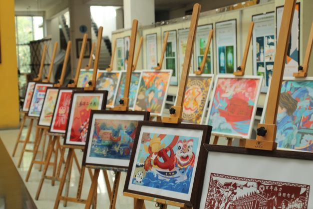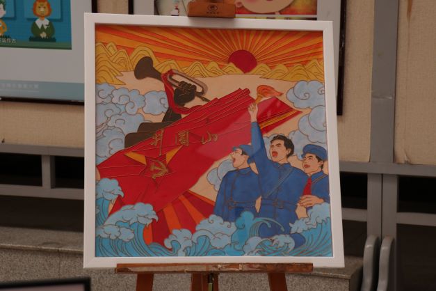 展出的百幅作品主题鲜明、构思精巧、形式多样,或大气磅礴、或苍劲厚重、或端庄内敛、或灵动秀美。学生用景泰蓝非遗手艺制作的“巍巍红船”踏浪启航、“革命第一山井冈山”展现星火燎原之势;用雕刻拓印手工艺制作的“最可爱的人”和“辉煌这十年”表达了青年对于人民英雄的礼赞与对祖国的热爱;用水粉、马克笔、丙烯、铅笔等手绘的中国百年奋斗史弘扬着伟大建党精神......100幅作品彰显了中华民族正以不可阻挡的步伐迈向伟大复兴。