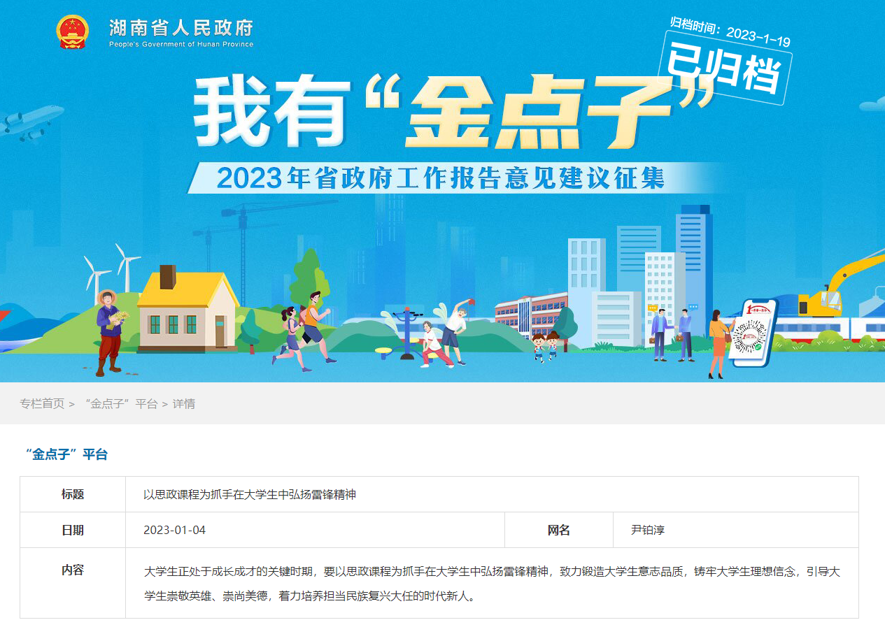 团队撰写的“金点子”《以思政课程为抓手在大学生中弘扬雷锋精神》被2023年湖南省政府工作报告意见建议征集活动采纳。