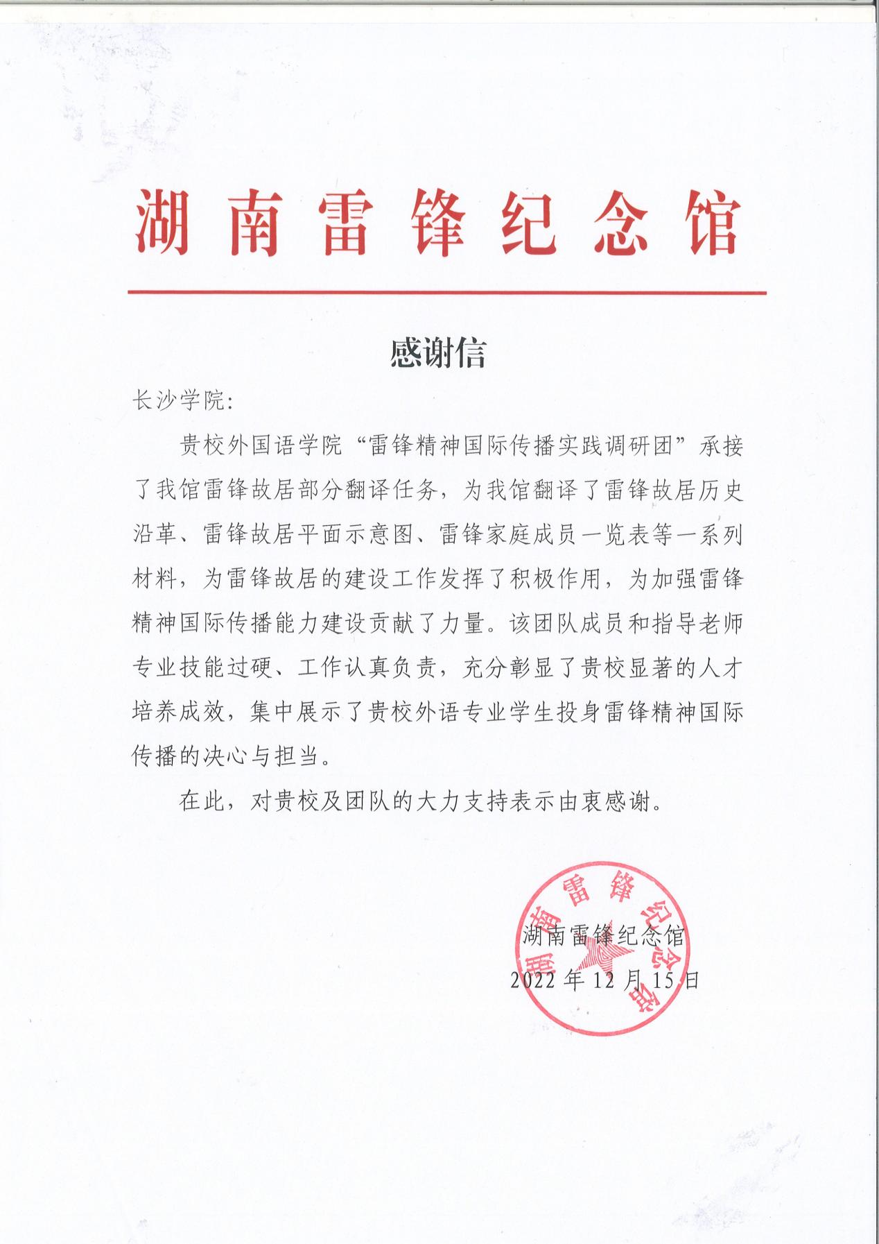 2022年12月,湖南雷锋纪念馆发来感谢信,对团队在加强雷锋精神国际传播能力建设、提升雷锋精神海外传播力和影响力等方面作出的贡献表示肯定。