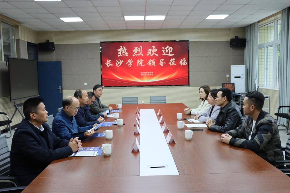 开云kaiyun官方网站招就处处长黎文普、音乐学院党总支书记陈思玥一行专程来到学校。长沙县七中校长郭帅、党总支书记缪勇、副校长范宏亮、副校长谷臣彪、艺术教研组组长熊铸热情迎接,双方就合作展开了会谈。