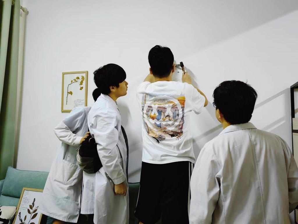 同学们亲手将制作的植物标本“上墙”装饰成长辅导室