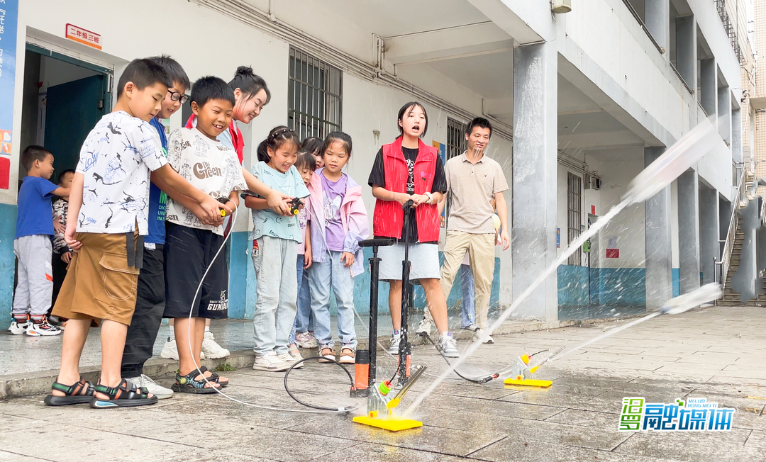 (白水镇越江学校二年级3班学生在教室外发射水火箭)