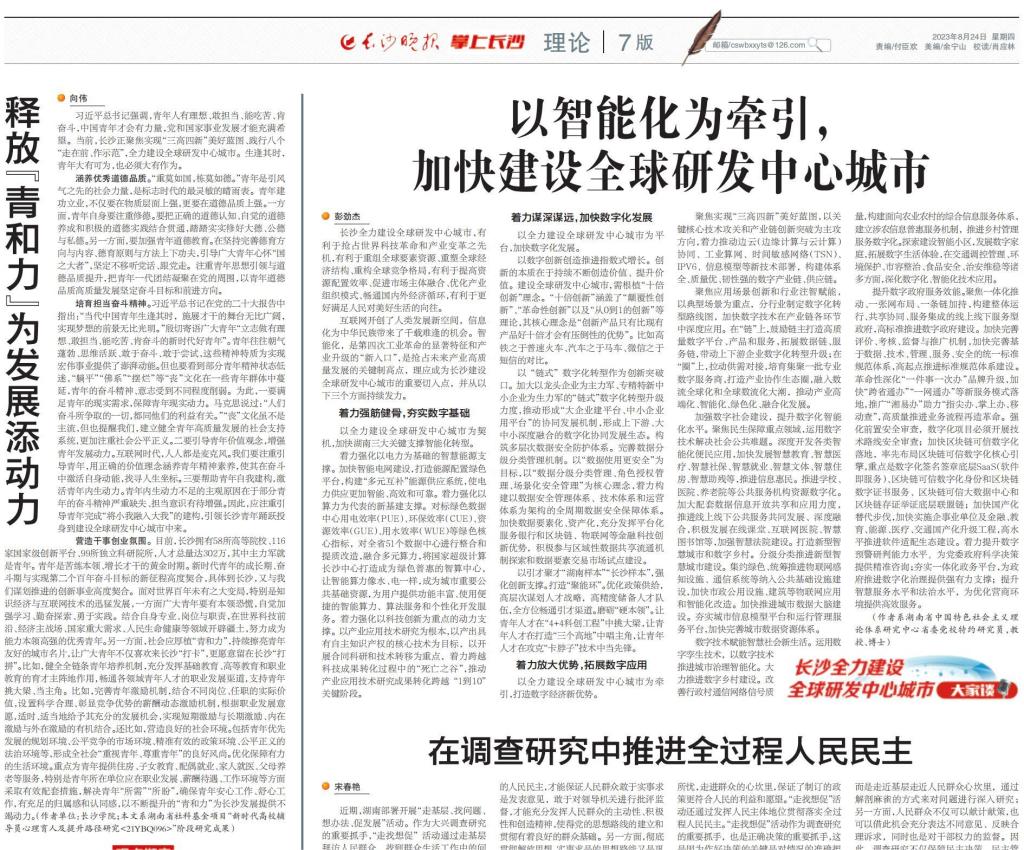 2023习近平总书记强调,青年人有理想、敢担当、能吃苦、肯奋斗,中国青年才会有力量,党和国家事业发展才能充满希望。当前,长沙正聚焦实现“三高四新”美好蓝图、践行八个“走在前、作示范”,全力建设全球研发中心城市。生逢其时,青年大有可为,也必须大有作为。涵养优秀道德品质。“重莫如国,栋莫如德。”青年是引风...